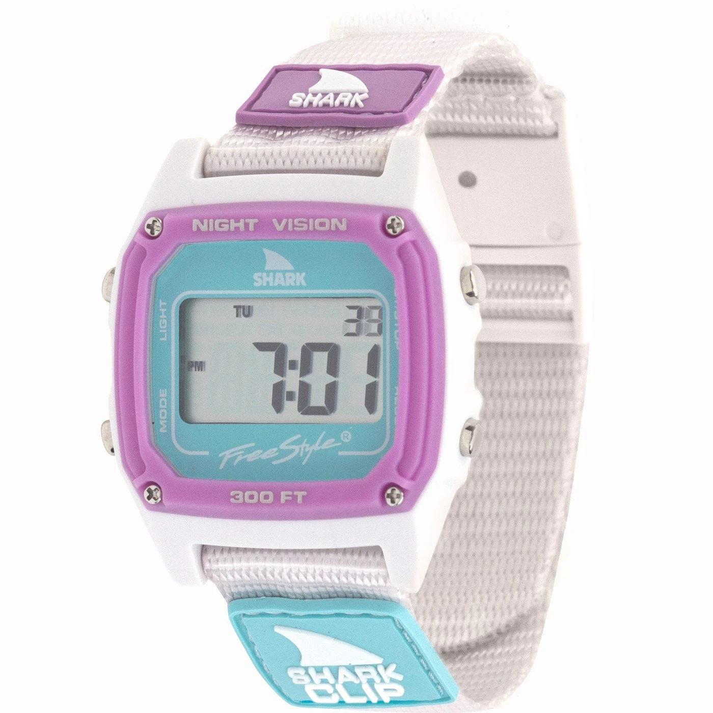 Retro-futurism at its finest! The Shark Clip features the original clip band system that ignited the Freestyle brand. Much like a seatbelt, just clip in to keep your watch safe, snug and comfortable. Like all Shark Watches, the Shark Clip is backed by our limited lifetime warranty. Other features include alarm, dual time, countdown timer, stopwatch, and night vision backlight.100 Meters water resistant and limited lifetime warranty Fs101060 / Watch Shark Clip Lavender Unicorn in Multi / Freestyle