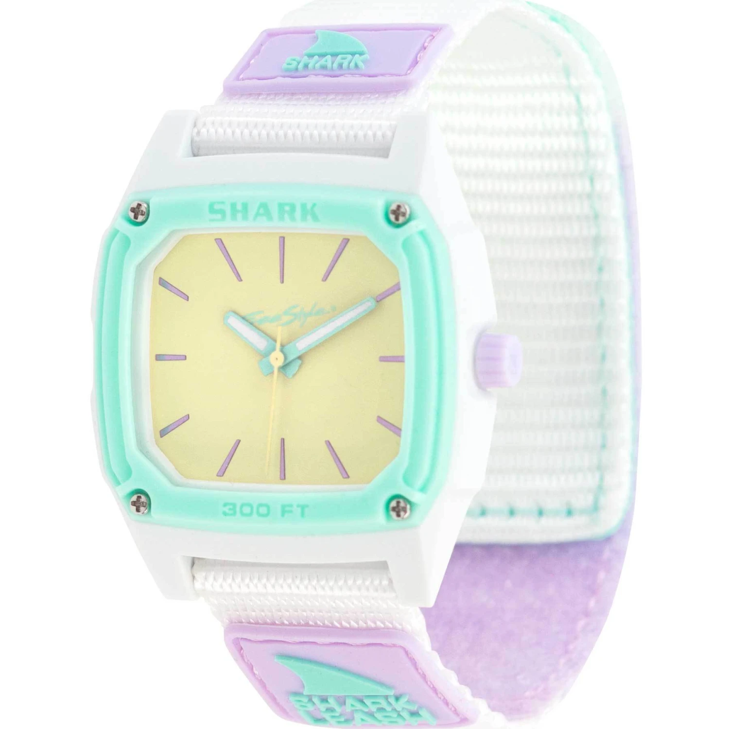 Time to Rock – D- Clock this season with the new Freestyle Shark analog clock dial collection. Just like the classic Freestyle Shark this new series demonstrates that timing and performance go hand in hand. Water—resistant to 300 ft and features the classic Shark Leash strap that is built to go with you on all your adventures in and out of the water. Style#: Fs101105 / Watch Shark Leash Analog Water Lily in Multi / Freestyle