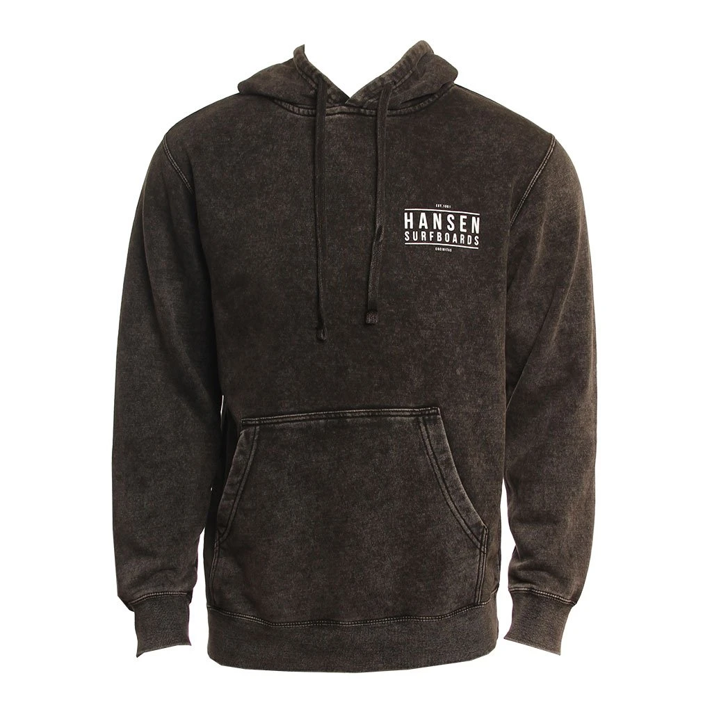 The Hansen mineral wash hooded sweatshirt is a 80% Cotton 20% Polyester blend fleece with front and back screen prints / Mens Sweatshirt Mineral Wash Hooded in Black / Small / Cotton/ Polyester / Hansen
