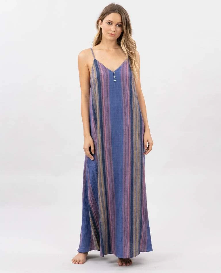 Cotton/linen yarn dye stripe 135 G Maxi length Custom yarn dye stripe Adjustable straps Button Detail Metal logo trim / Womens Dress Golden Days Stripe Maxi in Blue / Medium / Cotton / Rip Curl