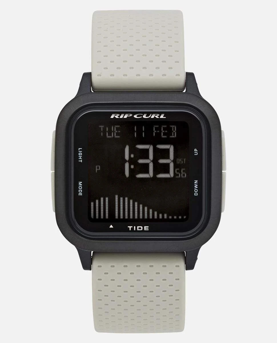 Surf, Sport, Style; a new digital tide watch for the next generation. Next Tide features 500 pre-programmed global tide locations with precise tide height graph, next tide time, direction and future forecasting plus Spot X. With a scratch resistant mineral crystal lens housed in a solid stainless steel bezel with a durable yet lightweight ergonomically rounded polycarbonate case, this stainless steel tide watch is both comfortable and tough. / Watch Next Tide in Sand / Rip Curl