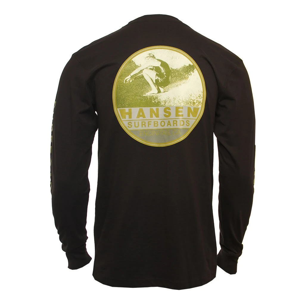 The Hansen Mens Toes Long Sleeve Shirt is a 100 % cotton tee with front and back screen prints. The picture is an iconic photo of Cheer Critchlow shot at Pillbox in Solana Beach. The photo was used in our 1968 Catalog, it is from the same shoot that we used the photo for our Iconic Sign! / Mens Shirt Toes Long Sleeve in Black / Small / Cotton / Hansen
